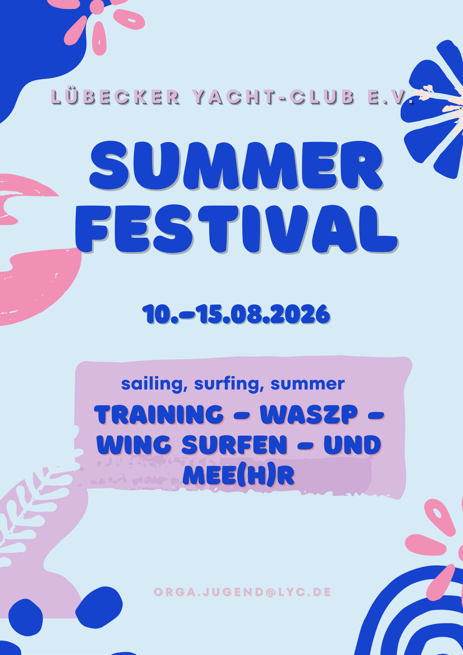 wir die Jugendabteilung des Lübecker Yacht-Club e.V. wollen dieses Jahr wieder ein sportliches Highlight setzen und laden alle herzlich ein, an unserem Summerfestival am Mövenstein, vom 10.-15.08.2026 teilzunehmen.