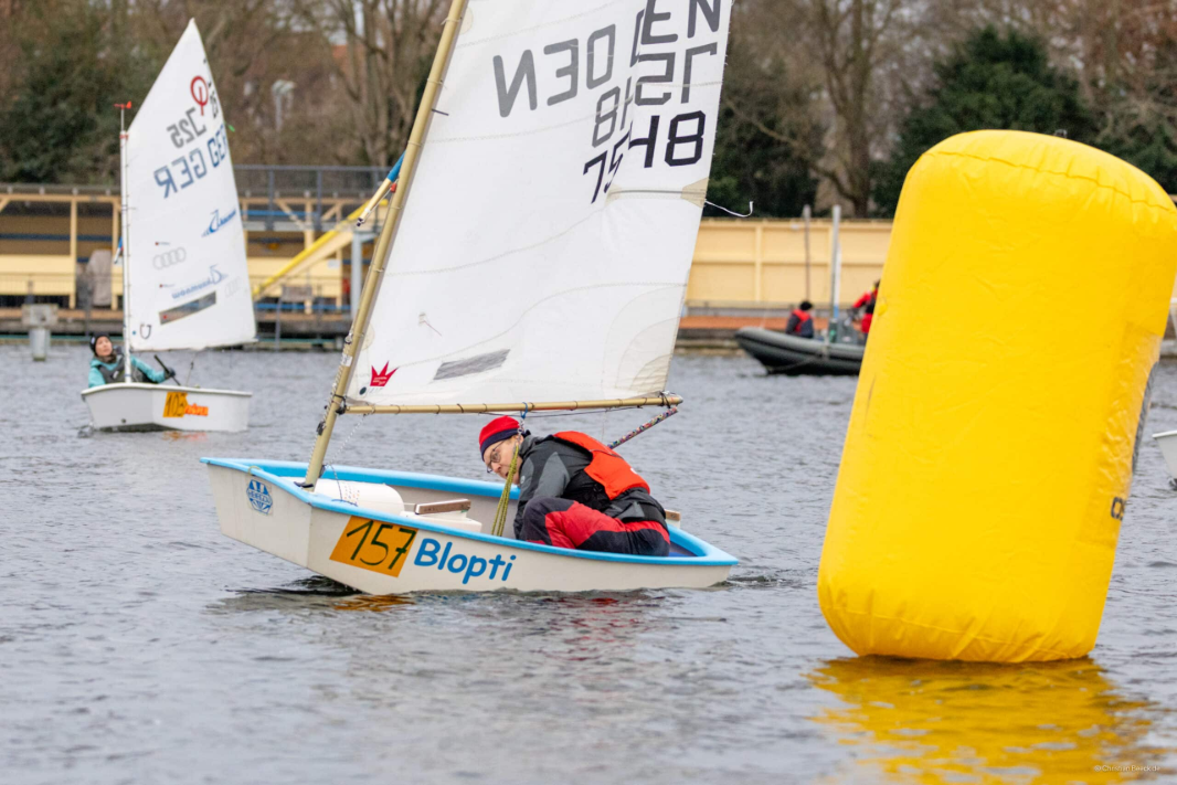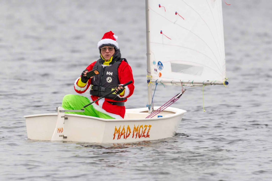Das konnte auch Organisator Jan Stemmler bestätigen: „Es war frisch auf der Wakenitz, aber der angekündigte Regen hat bis auf ein paar Tropfen einen Bogen um uns gemacht. Mit einem Feld von 61 Optimisten an der Linie hatten wir ein tolles Starterfeld. Dass viele mit Nikolaus-Outfit gesegelt sind, hat der Veranstaltung einen tollen Rahmen gegeben.“ Neben den vielen roten Mänteln gab es auch ein Engelskostüm von Heike Gercken, die ganz in Weiß und mit goldenen Flügeln bei dieser 57. Auflage des Eisarsch antrat. Sie wurde dafür ebenso mit einem Sonderpreis prämiert wie Peter Zoernack, der als Weihnachtsgrinch in den Opti stieg.