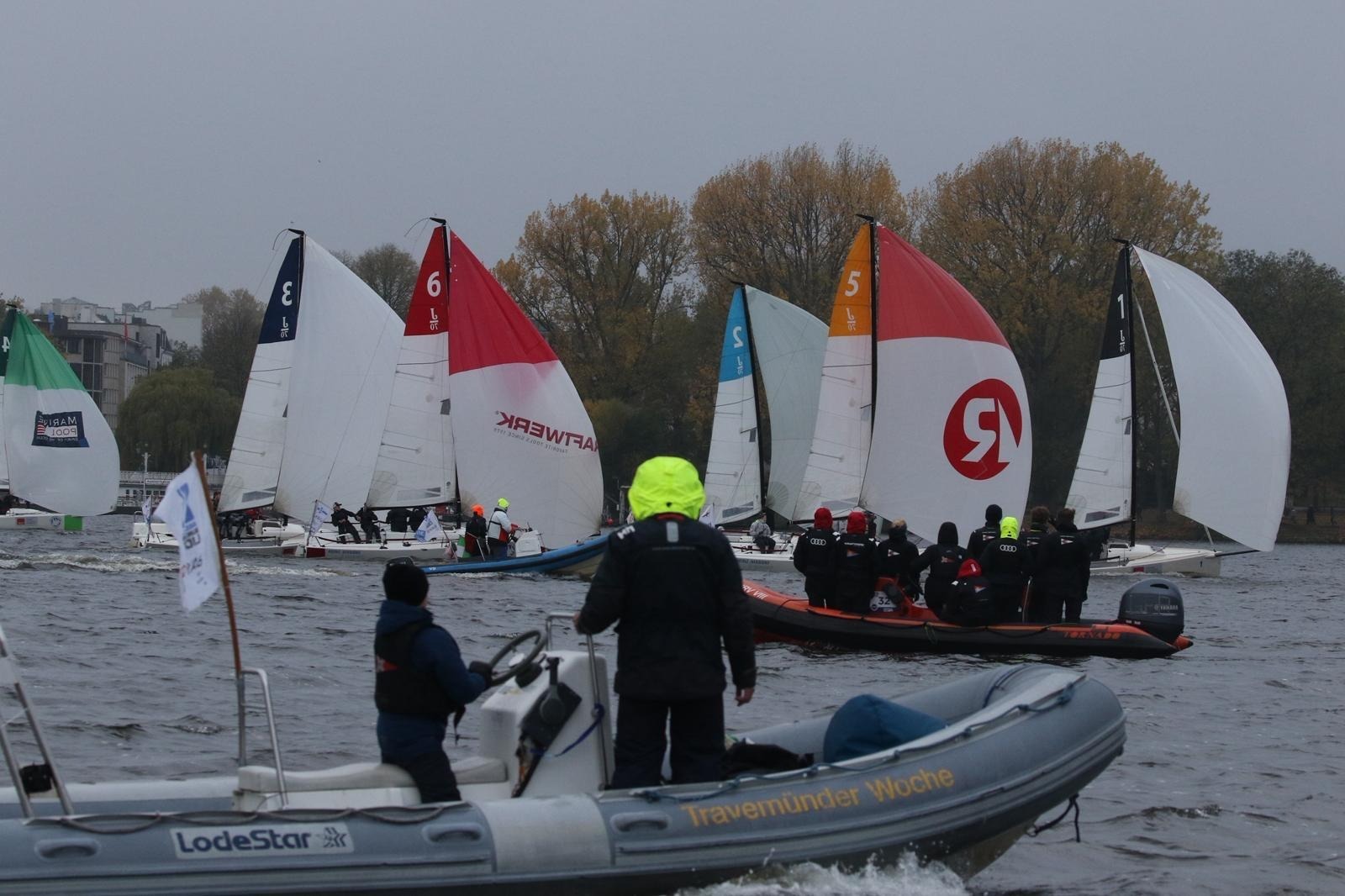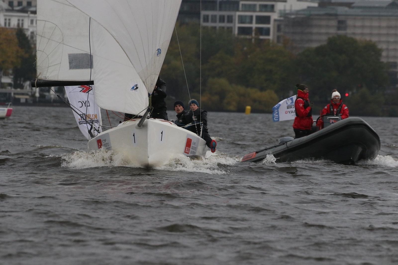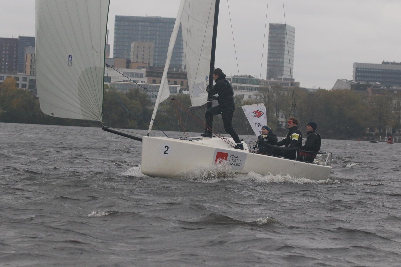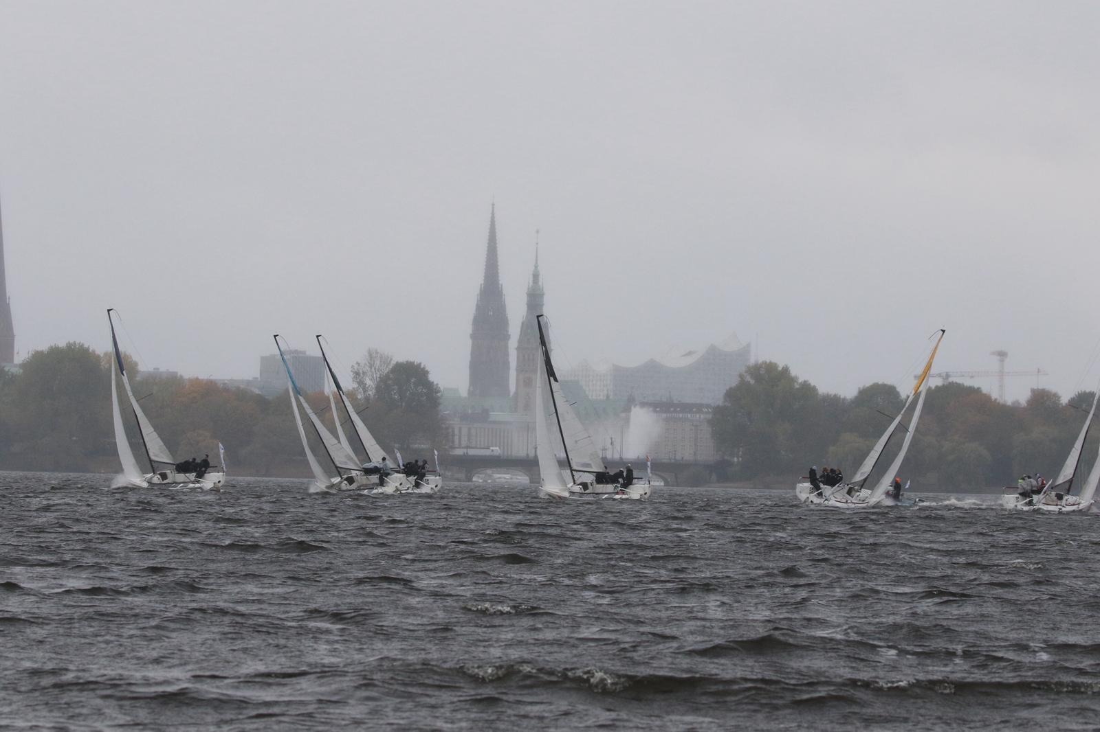 Der Wind zeigte sich an beiden Tagen von seiner kräftigen Seite. Am Samstag fegte ein ordentlicher Westwind über die Alster, begleitet von typischen Drehern und Böen, wie man sie in Hamburg kennt. Wir kamen damit gut zurecht und konnten die Bedingungen zu unserem Vorteil nutzen. Nach einem starken ersten Tag lagen wir auf Platz drei in der Zwischenwertung – eine richtig gute Ausgangslage.