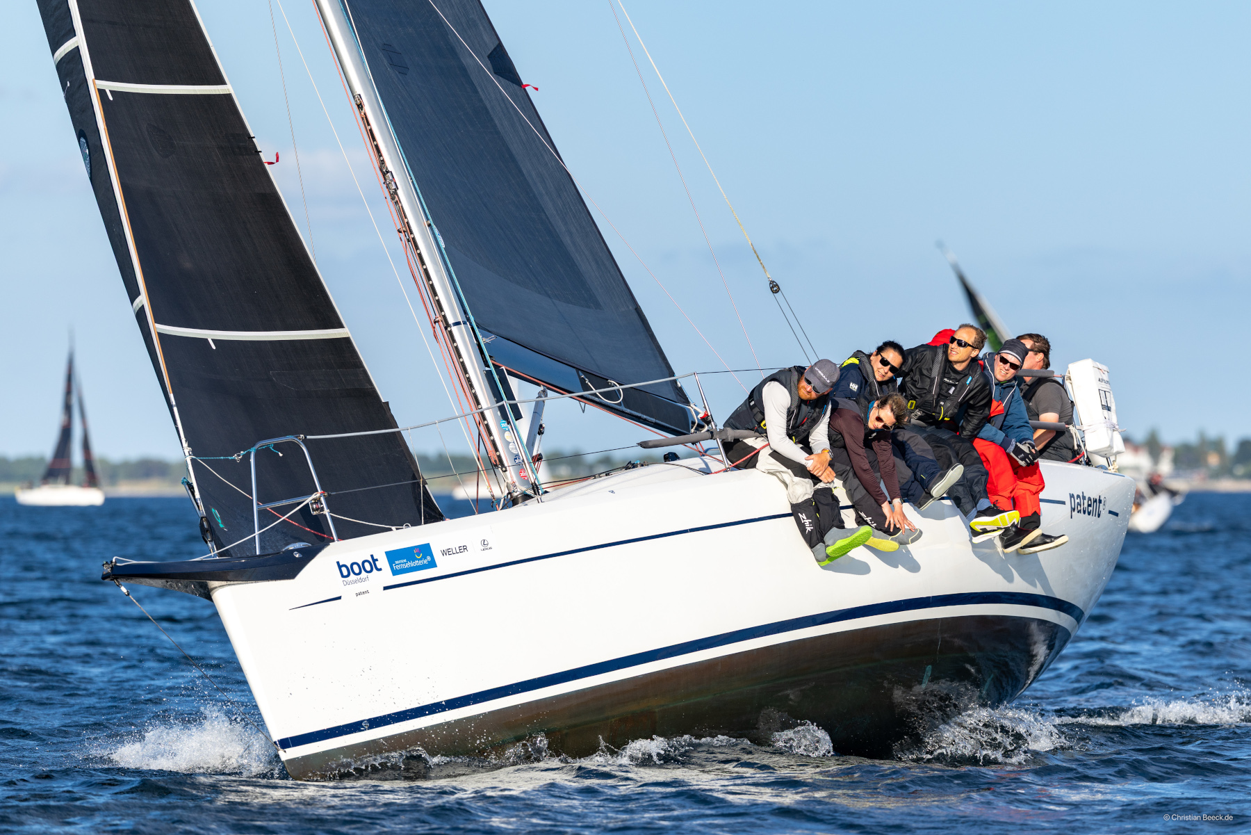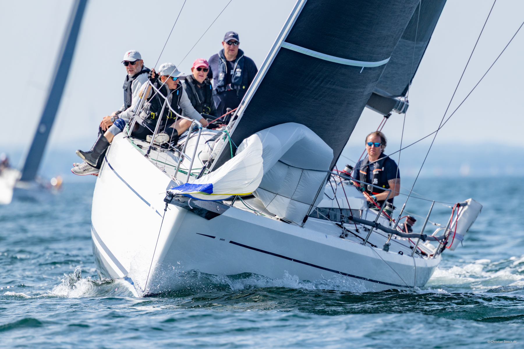 Anschließend ging es zur Dänischen Meisterschaft mit einem Zwischenstopp in Heiligenhafen, wo man wieder die Fehmarn-Rund-Regatta mitnahm. Allerdings erwartete die "patent4"-Crew dort kompliziertes Wetter. Zunächst Starkwind, und mit der Genua 4 klappte es an der Kreuz gut, aber auf dem anschließenden Am-Wind-Gang war das Segel dann doch zu klein. Dann der A4 hoch, aber der Wind drehte entgegen, und somit der A4 wieder runter. Der nächste Gang sah dann recht spitz aus, deshalb der A5 hoch, aber der Kurs entpuppte sich als Downwind-Gang, und die Spinnaker-Boote zogen vorbei. Somit blieb die Erkenntnis, dass man dann doch lieber hätte den A4 setzen sollen, und ein dritter Platz.